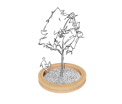We create three entrance squares that extend from the alleys into the garden, acting as terraces that transition between the city and the lush, green inner courtyard. The entrance squares are connected by a layered path system. Wooden footbridges provide the shortest route, slightly elevated above the rich planting. Additionally, a winding path offers a scenic route that is accessible to everyone. The rest of the courtyard is filled with abundant greenery, inspired by the surrounding landscape. We carve out a water feature and create various play, hideaway, and resting spots from the green space. Wooden logs connect these spots in a playful way.