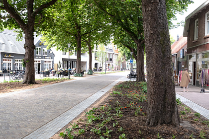 Noordstraat transforms into Haamstede’s promenade. The existing tree avenue – a defining spatial element – is preserved and strengthened. Generous planting beds beneath the trees improve growing conditions and introduce a lush, shade-tolerant planting palette with a predominantly green character. Two broad walking zones frame a central strip primarily used by cyclists. These flanking zones accommodate terraces, seating and planting in a clear and coherent arrangement, inspired by the historic street profile.