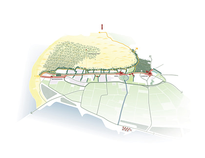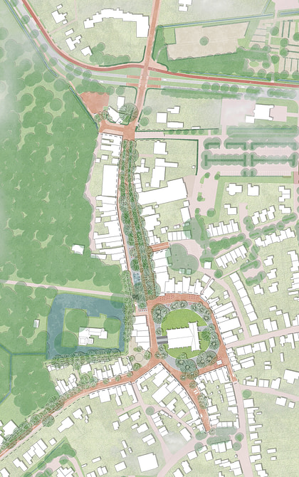 The Ring evolves into a green and cohesive village square. The removal of traffic lanes and parking restores its historic character as a place of encounter. A continuous pavement of natural stone gives the square a calm and informal atmosphere. At its center, the church garden is more fully integrated into the public realm. The existing wall is replaced by a new circular brick wall, lowered to seating height, forming a continuous edge that both protects the garden and invites use. Terraces are carefully positioned around the square for optimal sunlight while maintaining clear pedestrian flows.
