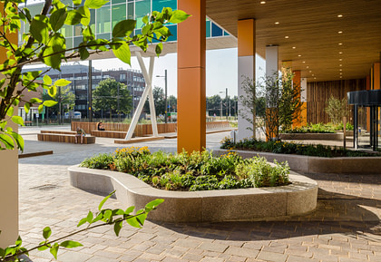 The hospital is located in a landscape chamber, framed by tree lanes. The design utilizes the surrounding landscape as a core quality by extending the meadow as far as possible towards the facade and by creating panoramas over the meadow. The main entrance and the entrance plaza of the PMC are located on the Hoofddijk. The entrance plaza is designed like a carpet and provides seating for patients and visitors. A bridge over one of the characteristic ditches emphasizes the landscape environment. Around the building, there are several gardens with sitting areas and colourful plant beds and there is room for all kinds of target groups and activities.