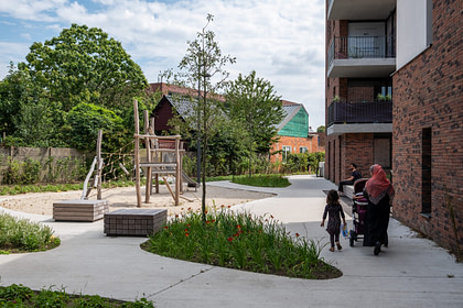 The public space of the Innovation Pool has a continuous surface of brick stones, with a darker plinth along the buildings. Parking places and pathways are paved with natural cobblestones. The courtyards have a green character, with flowering perennials and trees with vibrant fall colours. Rugged wooden benches link to the industrial past.