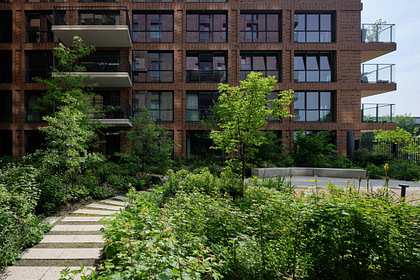 Rustige plekken om je terug te trekken en sociale interactie in één harmonieuze setting: geïnspireerd door dit principe ontwierp Bureau B+B twee binnenhoven voor de woningontwikkeling Terrazzo Paleiskwartier. De zachte topografie, weelderige beplanting en subtiele materialiteit creëren rustige hoekjes binnen een taps toelopende groene ruimte.