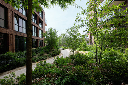 Een mix van hoogwaardige materialen en beplanting bepaalt de sfeer. De hoofdpaden, uitgevoerd in terrazzo betontegels, leiden door de binnenhoven, terwijl grindranden zorgen voor zachtere, informele plekken. Meerstammige bomen en een verscheidenheid aan vaste planten brengen seizoensgebonden kleur en textuur, terwijl de zachte topografie diepte en karakter aan de ruimte toevoegt.