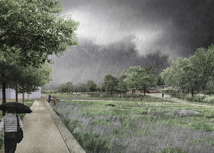 Het Buiksloterdijkpark wordt ontworpen met oog op het veranderende klimaat, met langere perioden van droogte, extreme neerslag en piekmomenten. Het park zal flexibel zijn en kunnen “mee-ademen” met deze klimaatveranderingen. We ontwerpen het daarom als een gebied dat kan mee-ademen met het klimaat; soms nat, soms droog, met inheemse beplanting die bestand is tegen deze schommelingen en die het hele jaar door een mooi aanzicht bieden. Drie waterbassins bergen het regenwater van de aangrenzende Klaprozenbuurt en koppelen dit vervolgens vertraagd af naar Zijkanaal I. Dit maakt de bassins tot een cruciaal en dynamisch onderdeel van het ontwerp. Het park is een belangrijk koppelstuk tussen de Kadoelerscheg, het Noorderpark en nabijgelegen schooltuinen. Het park wordt een ‘hub’ voor biodiversiteit door de contrasten tussen droog en hoog en nat en laag te vergroten. Een veelvoud aan dier- en plantsoorten zal zich hier thuis voelen en zo wordt migratie tussen verschillende zones mogelijk gemaakt. Bestaande bosschages en zoombeplanting blijven zoveel mogelijk behouden en worden geïntegreerd in het ontwerp.