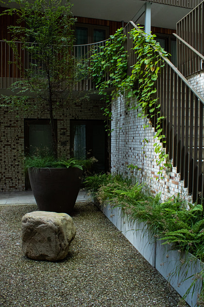 De binnenwereld van Lieven bestaat uit een reeks ruimtes met een verschillende dynamiek. Aan weerszijden van het centrale buurtplein liggen semi-openbare binnentuinen. De op maat ontworpen hekken gaan op in de begroeiing van de tuinen, waardoor bezoekers op subtiele wijze weten dat ze een gemeenschappelijke ruimte betreden en uitgenodigd worden binnen te komen. De voorste delen van de hoven hebben een gemeenschappelijk karakter. Hier is ruimte voor ontmoeting, spelletjes of een buurtbarbecue. De met grind verharde voetpaden leiden subtiel naar de achterzijde van de hoven waar zich rustige en besloten plekken bevinden waar bewoners zich kunnen terugtrekken om te lezen, in de tuin te werken of te luieren. Door gebruik te maken van de kloofachtige ruimte, de verticale elementen en het gefilterde licht, vormen de patio’s een eigen microklimaat binnen de gebouwen van de stedelijke campus. De grote stenen, de grassen en varens en de Nothofagus antarctica bomen geven het onderste deel van de patio’s de betoverende sfeer van een bergbos. Weelderig klimmende Aristolochia macrophylla veranderen het open trappenhuis in een semi-transparante groene muur die bezoekers naar de hogere verdiepingen leidt met weidse uitzichten over de binnentuinen.